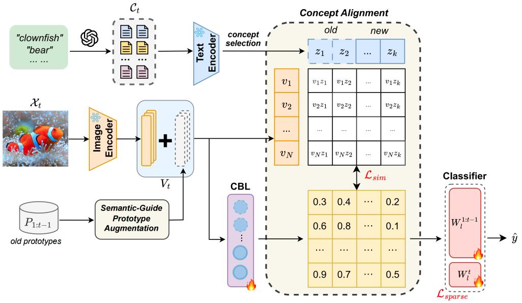 该论文由我院余璐副教授以及所指导的2023级硕士研究生韩昊宇撰写。持续学习(Continual Learning)的目标是使学习系统能够不断获取新知识,同时不遗忘先前学习的信息。持续面临的挑战在于缓解灾难性遗忘(catastrophic forgetting)的同时保持跨任务的可解释性。现有的大多数持续方法主要侧重于保留已学知识以提高模型性能。然而,随着新信息的引入,学习过程的可解释性对于理解不断演化的决策机制至关重要,但这一方向却鲜少被探索。本研究提出了一种新颖框架,通过整合语言引导的概念瓶颈模型(Concept Bottleneck Models, CBMs)来同时应对这两大挑战。我们的方法利用概念瓶颈层(Concept Bottleneck Layer),与CLIP模型对齐语义一致性,从而学习人类可理解、且能跨任务泛化的概念。通过聚焦于可解释的概念,该方法不仅增强了模型随时间推移保留知识的能力,还提供了透明的决策洞察。我们在多个数据集上验证了方法的有效性,其中在ImageNet子集上的最终平均准确率超越现有最优方法达3.06%。此外,我们通过概念可视化展示模型预测依据,进一步推动了可解释持续学习的理解。