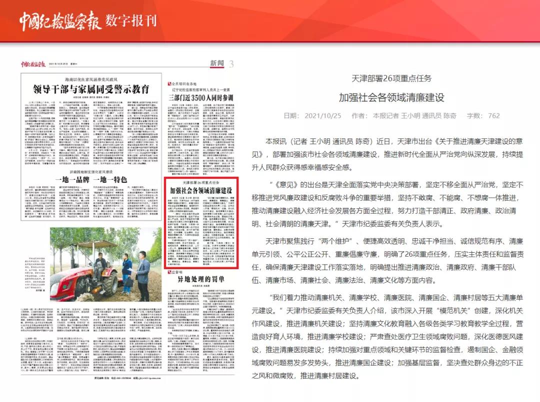 10月25日,《中国纪检监察报》刊文《天津部署26项重点任务 加强社会各领域清廉建设》,关注报道了天津市出台《关于推进清廉天津建设的意见》,明确提出推进清廉政治、清廉政府、清廉干部队伍、清廉市场、清廉社会、清廉法治、清廉文化等方面内容,推动清廉建设融入经济社会发展各方面全过程,持续提升人民群众获得感幸福感安全感。